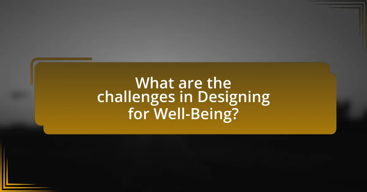 The challenges in designing for well-being include balancing user needs with environmental sustainability, addressing diverse cultural perspectives, and integrating multidisciplinary approaches. Designers must consider how to create spaces and products that promote mental and physical health while minimizing ecological impact. For instance, research indicates that environments designed with natural elements can enhance well-being, yet sourcing sustainable materials can be complex and costly. Additionally, cultural differences in perceptions of well-being necessitate inclusive design practices that cater to various user experiences. These factors complicate the design process, requiring collaboration among architects, psychologists, and environmental scientists to achieve effective solutions.